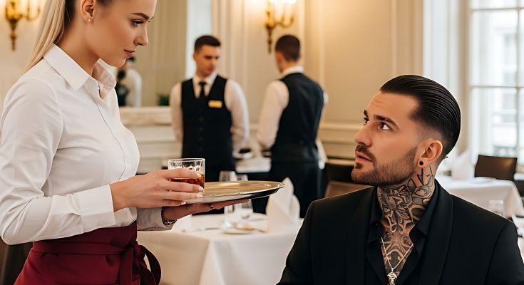 A young server approached their table with a tray of drinks. His hands were shaking so badly one of the glasses tipped, splashing whiskey across Damian’s cuff.