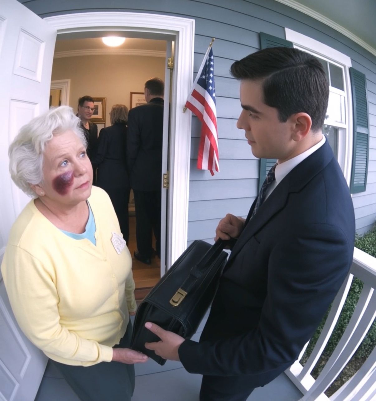 “Adult Protective Services,” the woman says, showing her badge. “We received a report of possible abuse and financial exploitation at this address. I’m here to conduct an investigation.”